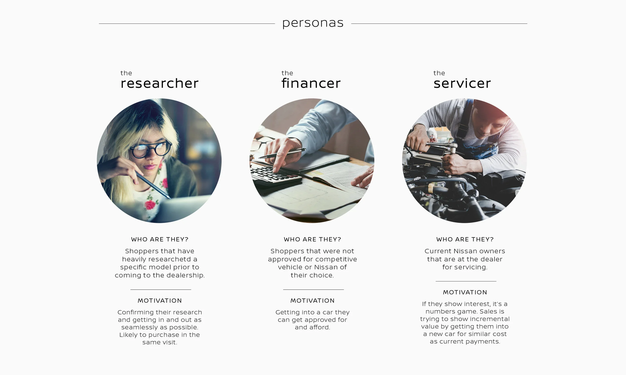 In an overwhelming lineup of 17 vehicles, this app was designed to help consumers narrow down or pinpoint a Nissan vehicle that best suits their needs in a straightforward and simple experience. Based off three different user personas, three different user paths were created: research, comparison and match finder. The goal was to educate consumers to their exact vehicle needs and wants, allowing them to have easy and knowledgeable conversation with dealers.